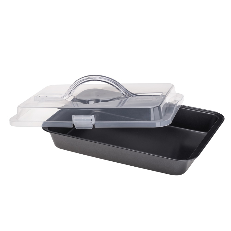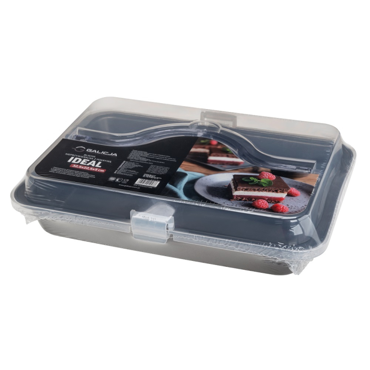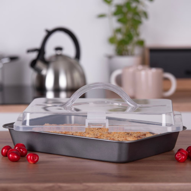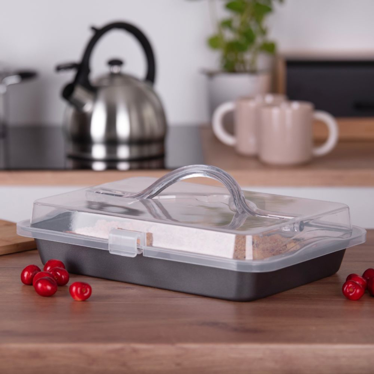 W zestawie znajduje się praktyczna pokrywa z zatrzaskami i uchwytem, dzięki której bezpiecznie przeniesiesz swoje wypieki. Idealne rozwiązanie na rodzinne spotkania, do pracy czy na przyjęcia.