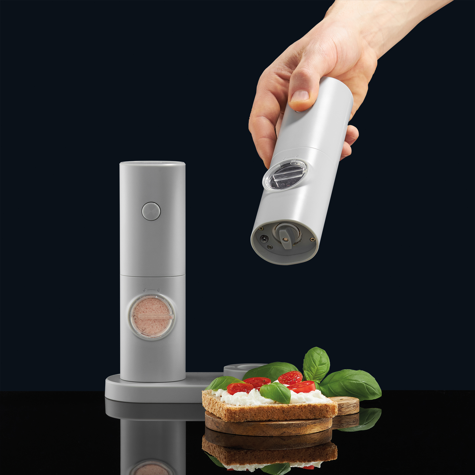 Komplet elektrycznych młynków do soli i pieprzu Mellizo – szary, nowoczesny design Ambition